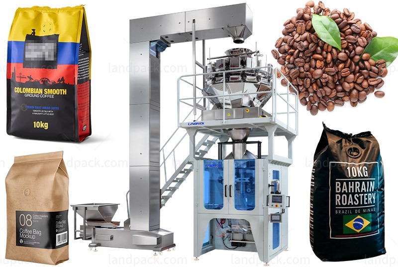 1. Coffee Material Feeding → 2. Multi-head Weigher Weighing → 3. Roll Film Feeding → 4. Thermal Transfer Printer → 5. Labeling on The Roll Film → 6. Punch Holes and Install Degassing Valves → 7. Film Forming → 8. Heat Sealing And Cutting → 9. Finished Product Output