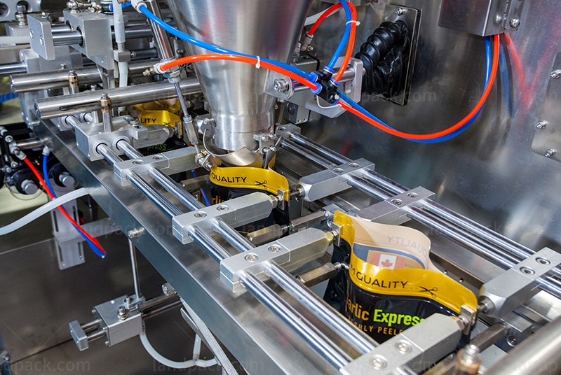 This horizontal premade pouch packing machine is suitable for automatic packaging of granule and solid products in pre-formed bags. It is widely used for garlic cloves, peeled garlic, chopped garlic, frozen food, pet food, nuts, dried fruits, and snack products, pickled and preserved food, vegetables, chocolate, etc. Other free-flowing or semi-free-flowing products.