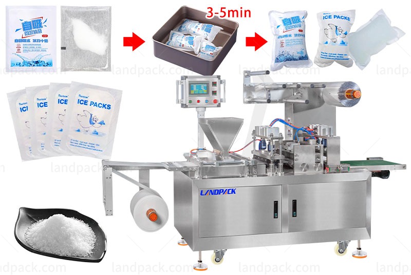 This ice pack four-side seal packaging machine is designed for flat, pillow-style four-side sealed pouches made from laminated films.