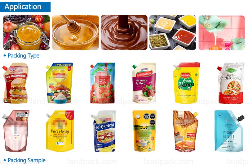 This pouch filling machine is generally used for filling and sealing stand-up pouch for packaging liquids and semi-liquid products. Suitable for banana sauce, ketchup, juice, jelly, soy milk, yogurt, seasoning, detergent, mineral water, juice, ice cream, edible oil, seasoning, laundry detergent, etc.